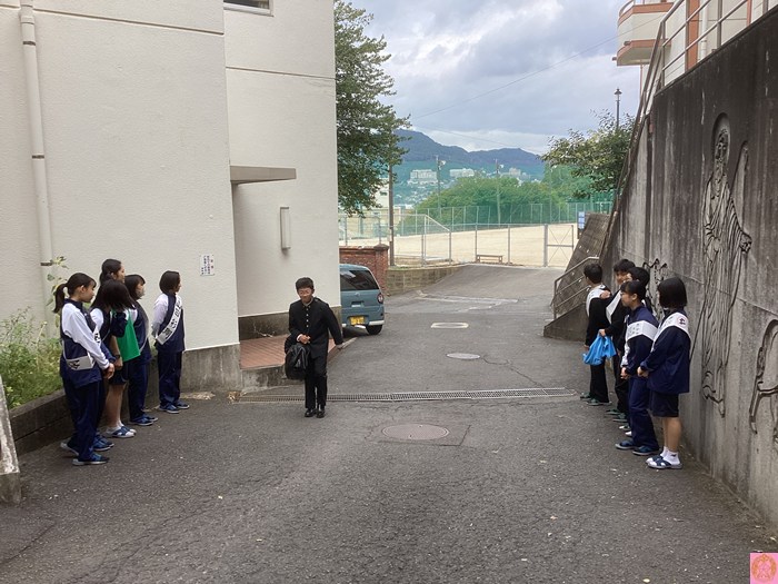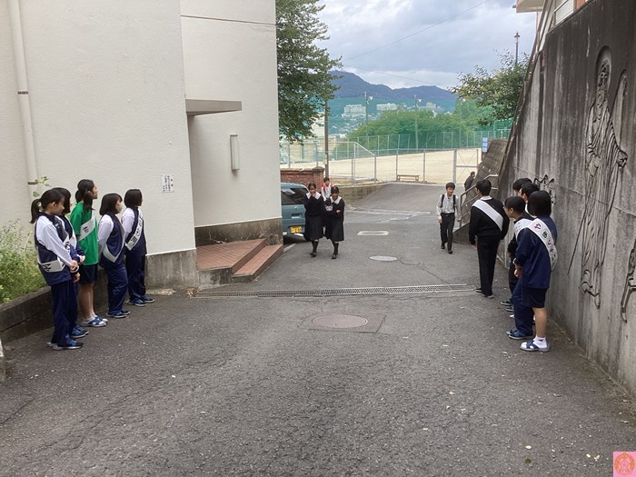 毎朝、中学玄関前では立候補者たちが元気な声で挨拶をする朝の挨拶運動を展開しました。