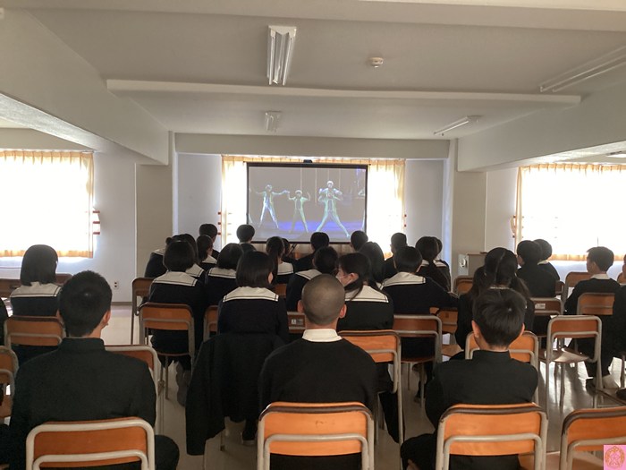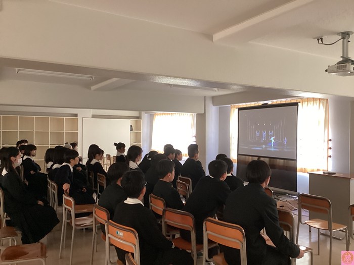 機械に管理された未来の学校で、ロボットのエルコスが子供たちの心に希望を取り戻していく物語に、生徒たちは時に笑い声を上げながら、前のめりになって見入っていました。