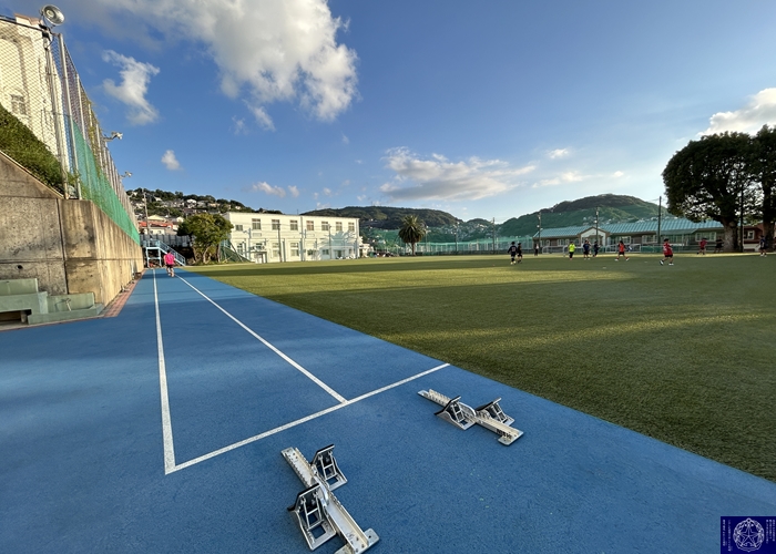 中央館玄関を出ると、秋風に吹かれながらブルータータンで黙々と走る陸上部の生徒の姿。
