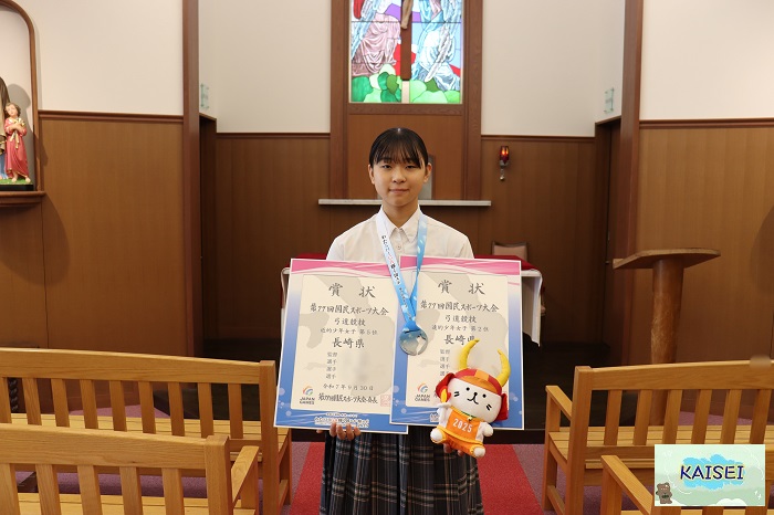 滋賀県で開催されている国民スポーツ大会において、長崎県代表として弓道競技に参加していた3年生の西さん。