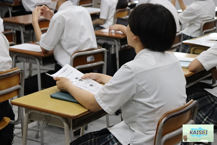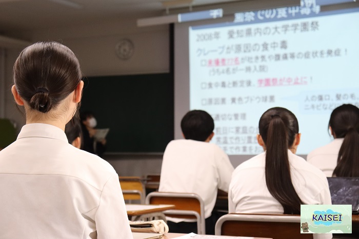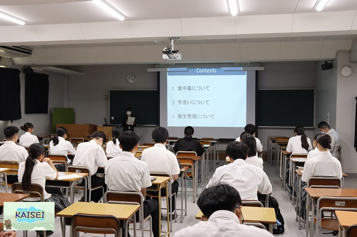 食中毒が起こることが絶対にないように、生徒たちは真剣な表情で講習会を聴いていました。