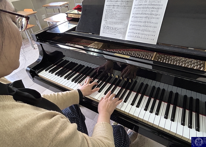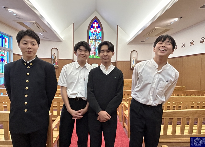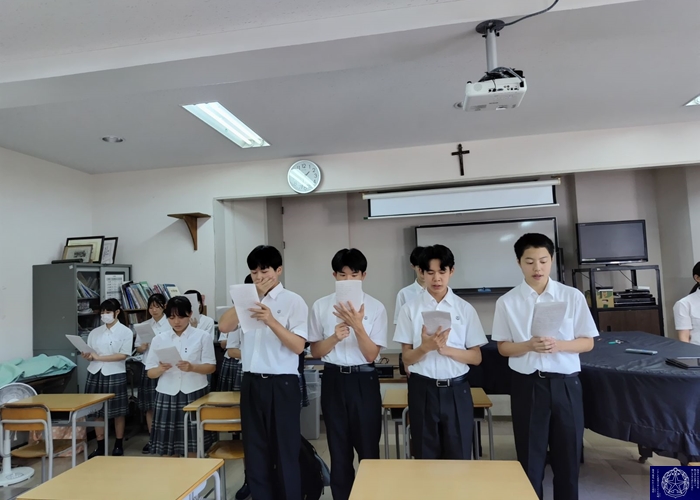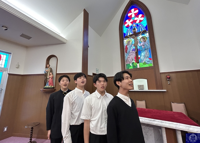「7月に有志の皆さんで聖歌の録音を行いました。録音後にはおやつを食べながら楽しく交流もできて楽しいひと時を過ごしました。全校で聖歌を練習する機会は少ないので、昼休みにこの音源を流すことで、少しでも聖歌に親しんでもらえればと思います。慰霊ミサでは『いつくしみふかき』『神ともにいまして』『めぐみのみ母よ』『地の上のどこにも』の4曲を歌います。聖歌は祈りです。厳粛なミサの中で、元気な歌声が祈りを届けてくれることを期待しています。」