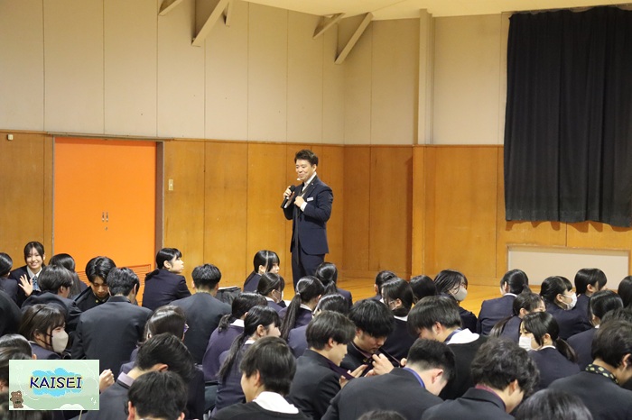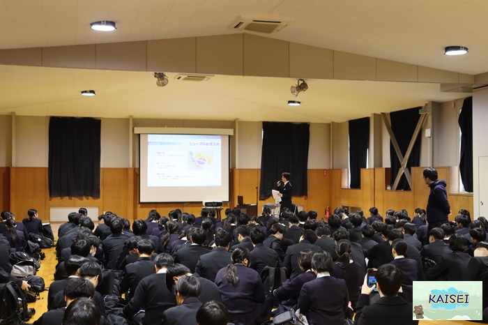 洋服の青山の方に来ていただき、生徒はフォーマルな場での装いや振る舞いについてレクチャーを受けました。