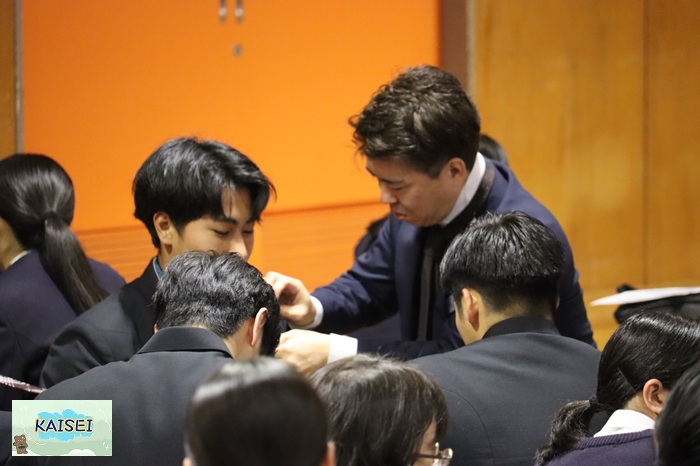 また、会の終盤には、男子生徒を対象にネクタイの結び方を実践していただきました。